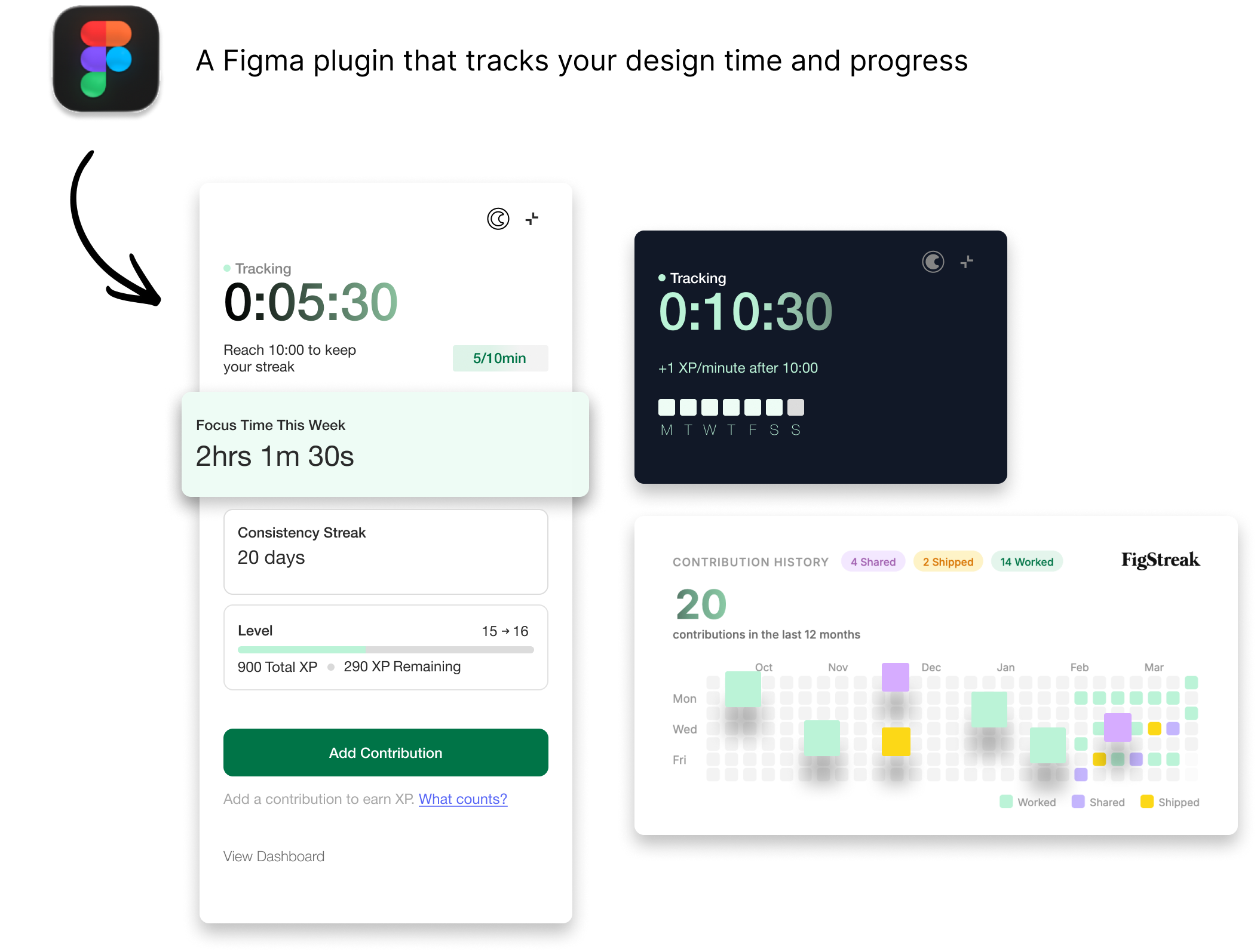 FigStreak is a Figma plugin that automatically tracks your focused design time — turning it into streaks, XP (experience points), and a shareable record you can actually show people.